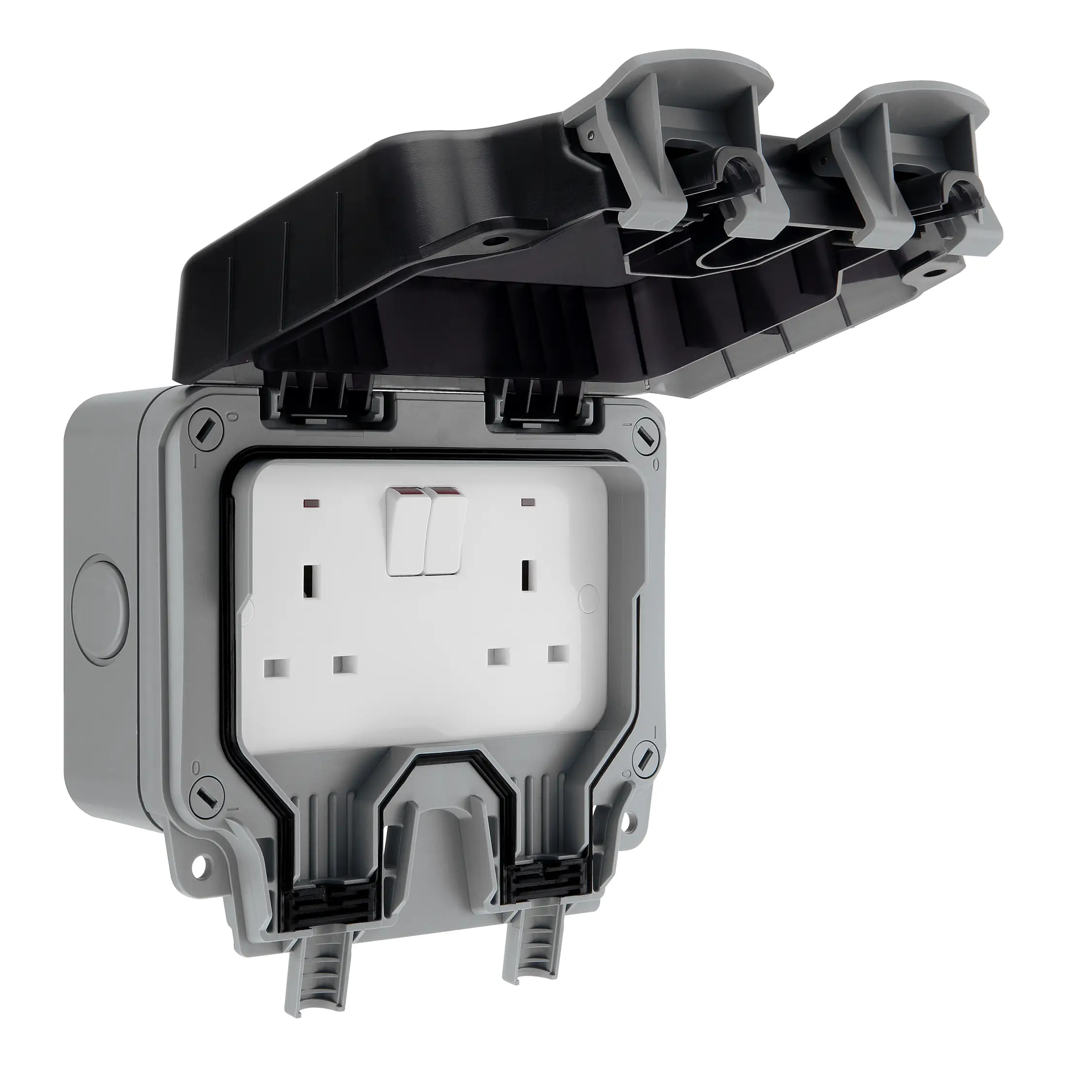 Designed for convenience and reliability, this double socket features a durable cover that stays open for easy access, along with large open/close paddles for smooth operation. The sockets include LED indicators and a patented cable entry system that prevents accidental opening when cables are pulled. Fast and easy installation with no separate screws or screw covers required makes this socket outlet user-friendly and efficient for any project.
