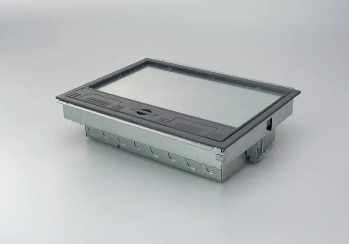 A high-quality galvanised steel floor box designed for carpeted floors. Features multiple knockouts for flexible conduit, a strong polycarbonate frame and lid, and a compact design for easy installation. IP20 rated with Clean Earth Sockets available.